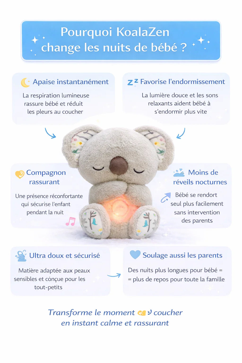 KoalaZen est une peluche apaisante conçue pour aider bébé à s’endormir plus facilement et passer des nuits plus calmes.Grâce à sa respiration lumineuse sa veilleuse douce et ses sons relaxants, elle rassure l’enfant au moment du coucher et réduit les réveils nocturnesUn compagnon réconfortant pour bébé… et plus de repos pour toute la famille